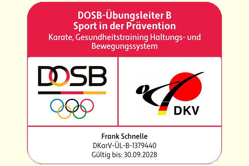 Unser Karate- und Gesundheitstrainer Frank Schnelle, besitzt ab sofort – zusätzlich zu seinen bisherigen Trainerlizenzen – auch die Lizenz "DOSB-Übungsleiter B Sport in der Prävention".