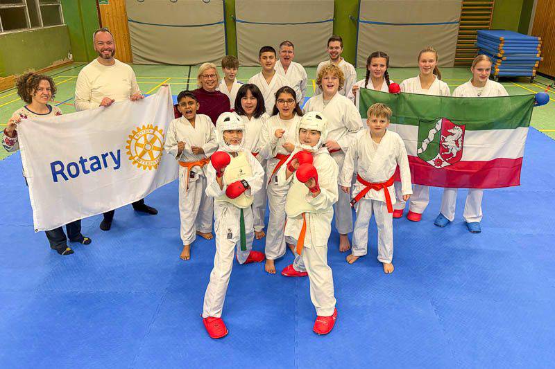 Foto: Dr. Wiebke Krüger, Christian Osada und Ulrike Schwarze vom Rotary Club mit jungen Karateka der BTW-Wettkampfgruppe.